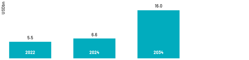 Having said this, the DC industry in the Middle East is quite well developed already, being valued at USD6.6bn in 2024, and is estimated to grow at a CAGR of 9.3% from 2025 to 2034, according to Global Market Insights (GMI). The UAE’s market is expected to cross USD4bn by 2034 according to GMI, while Saudi Arabia’s is expected to record a CAGR of 9.3% from 2024 (c.USD1.5bn) to 2030 (c.USD2.5bn), according to Prescient and Strategic Intelligence. In contrast, Fortune Business Insights estimates the global DC market at USD26.8bn in 2024 and expects it to post a CAGR of 7.6% from 2024 to 2032 (c.USD48.2bn) while reaching c.USD10bn in the US by 2032.